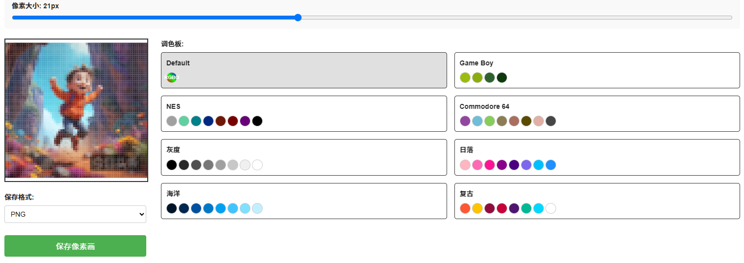 • AI 图片转像素画:一键将普通图片转为趣味像素画,支持自定义像素大小(如 21px)、调色板风格(含 Game BoyNES、复古、日落等)及保存格式(PNG),满足创意设计需求。